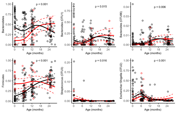 The gut microbiota development over time in children was analysed using statistical models with age of the child as the only independent variable. Age was modelled using restricted cubic splines with 4 knots at the 5th, 35th, 65th, and 95th percentiles to allow for nonlinear associations.