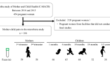 Both faecal and saliva samples were collected following a standardized protocol17. Faecal samples were collected from the children 2–4 days after birth and at 6, 12, and 24 months of age, whereas maternal samples were collected at gestational week 26–28, and 6 months post-partum. The neonatal faecal samples were collected by the midwife at the routine health check-up after birth. The remaining faecal samples were collected by the parents the day before visits to the test centre. Faecal samples were kept frozen at home and transported to the test centre in a cool transport container to prevent thawing. Subsequently, faecal samples were stored at − 80 °C until processing. Saliva samples from children were collected in the evenings at 6, 12, and 24 months of age using cotton swabs placed into Salivette tubes (Salivette–Sarstedt), whereas samples from mothers were collected in Salivette tubes according to a standard protocol one evening during gestational week 26–2818. The saliva samples were stored overnight at standard refrigerator temperature. Ethical approval for the study was granted by the Regional Ethics Review Board in Stockholm, Sweden (reference numbers 2011/192–31/2, 2011/1127–31/3, and 2014/1081–32 with amendments) and complied with the World Medical Association Declaration of Helsinki regarding ethical conduct of research. Informed consent for each participant in the maternal cohort was obtained during enrolment into the study and both parents gave informed consent for their children.
