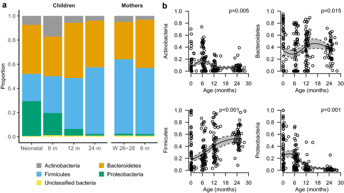 At the phylum level we noted an association of age with an increase in relative abundance of Firmicutes (p < 0.001), a decrease of Proteobacteria (p < 0.001), an inverse U-shaped association with highest prevalence at 6 months for Actinobacteria (p = 0.005) and a non-linear association between Bacteroidetes and age (p = 0.015) (Fig. 4a,b). At 24 months, the phylum distribution in children was similar to the mothers. The analysis at family level indicated that the observed association with age was mainly driven by Bifidobacteriaceae for the phylum Actinobacteria and by Enterobacteriaceae for the phylum Proteobacteria (Supplementary Fig. S4). For Firmicutes no single major contributor at the family level was observed (Supplementary Fig. S4).