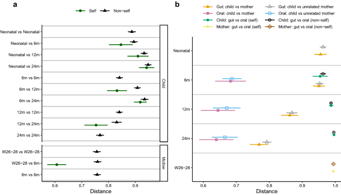 Comparison of microbiota composition based on Bray–Curtis distances. The shorter the distance between any pair of comparisons indicate greater similarity between microbial communities collected at those times. W gestational week and m month. Symbols represent means and error bars 95% confidence intervals. (a) Comparisons of gut microbiota at different sampling times, where distances between different sampling points within the same child/mother (self), and distances between unrelated children (non-self) and between unrelated mothers (non-self) are denoted. (b) Comparisons between gut and oral microbiota, and between children and their mothers and unrelated mothers. The distance between child and mother is based on the maternal sample at gestational week 26–28.