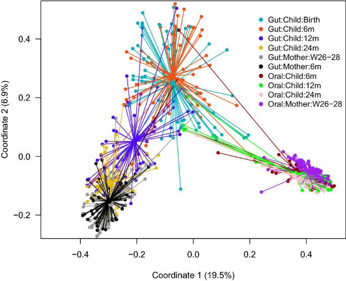 본 스웨덴 코호트 연구(83명의 아동 대상)에서 우리는 장내 미생물 군집이 연령에 따라 발달하며, 약 2세 경에 성인형 미생물 구성을 획득함을 관찰했다. 거리 기반 유사도 분석 결과, 장내 미생물 군집과 구강 미생물 군집 간의 유사도는 생후 6개월 이후 감소했으나, 이미 이 시점에서 두 군집은 매우 상이했으며, 2세 시점에서는 두 군집이 뚜렷이 달랐다. 분만 방식은 전체 장내 미생물군 구성에 차이를 보였다.