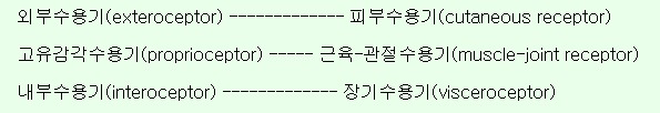 저온과 고온에 반응하는 온도수용기와 통각 등의 유해자극에 반응하는 유해자극수용기는 모두 자유신경종말(free nerve ending)로 믿어진다