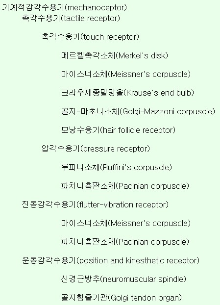 가. 촉각수용기 - 메르켈소체, 마이스너소체, 크라우제종말망울, 골지소체, 모낭수용기