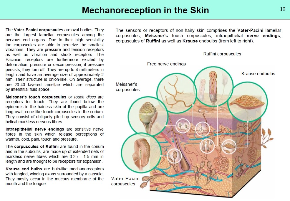 넓은 의미의 촉각을 감지하는 수용기(tactile receptor)에는 메르켈12)촉각소체(Merkel's disk), 루피니13)소체(Ruffini's corpuscle), 마이스너14)소체(Meissner's corpuscle), 크라우제15)종말망울(Krause's end bulb), 골지16)-마초니17)소체(Golgi-Mazzoni corpuscle), 파치니18)층판소체(Pacinian corpuscle), 모낭수용기(hair follicle receptor) 등이 있다(그림 5-18, 5-19).