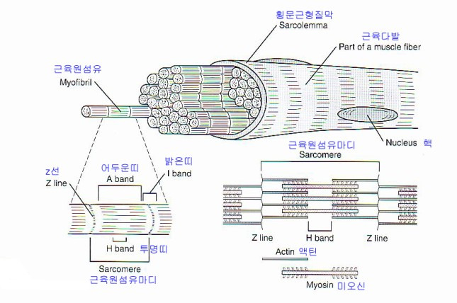 - 근원섬유는 근세포를 수축시키는 구조요소로서 마이오신과 액틴이라는 근 필라멘트로 되어 있다. 마이오신 필라멘트의 굵기는 16nm(머리카락 직경의 1/10000)이고, 액틴필라멘트는 6nm이다. 이 마이오신과 액틴 필라멘트는 골격근의 최소 기능단위인 근절내에서 긴 방향으로 배열되어 있다.