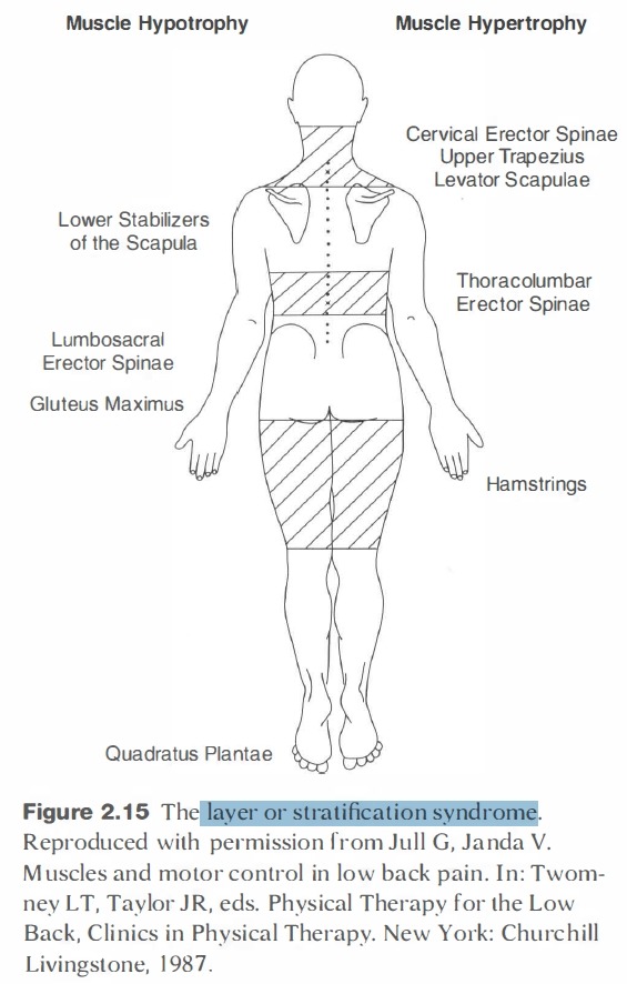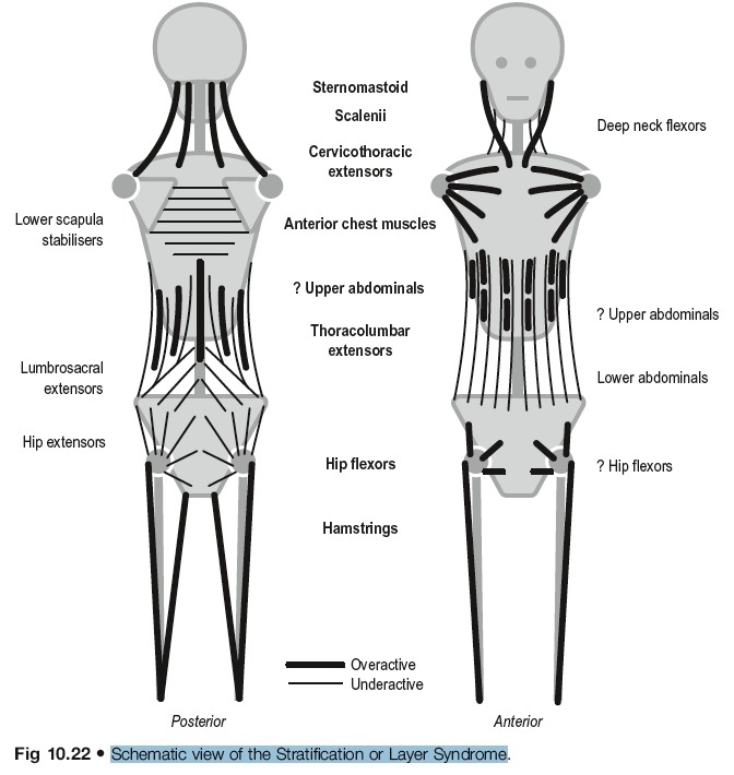 Described by Janda,3–5 strata or ‘layers’ of muscle hyper and hypoactivity can be observed within the flexor and extensor muscle systems. When both the pelvic and shoulder crossed syndromes are evident they are also expressed in this syndrome. Janda felt this was the most important of his ‘syndromes’,55 its presence a sign of poor prognosis because the fixed patterns of muscle imbalance reflect severe and deeply fixed CNS dysregulation accompanied by very bad movement patterns.3,4 However, he also says ‘this syndrome is not rare. On the contrary it can be seen quite often in sportsmen who have trained heavily without precise check ups’.3 Janda’s genius is confirmed! Observing the posturomovement patterns of subjects with spinal pain disorders consistently reveals common patterns of response