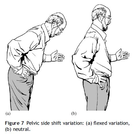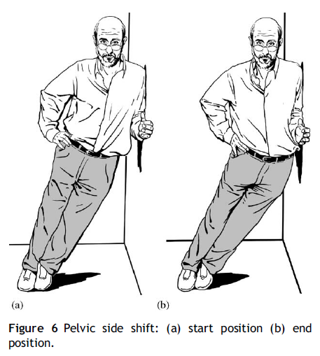그리고 만약 허리가 한쪽으로 구부정한 잠긴(locked) 자세를 취한다면, 허리를 펴주기 위해 거울을 보며 골반운동을 수행할 수 있습니다. 위 그림과 같이 평평한 벽과 나란히 옆으로 서서 약 2걸음 정도 떨어진 뒤 발을 벽과 수평으로 한 상태에서 상체를 벽에 기댄 채 골반을 밀어주는 운동을 수행합니다. 이렇게 천천히 허리를 밀어주는 운동을 8~10회 정도 하루에 여러번 수행합니다.
