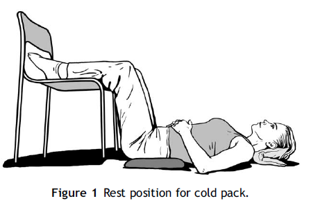먼저 허리 디스크 탈출이나 척추관 협착증 등으로 좌골신경통이라고 진단을 받으면, 먼저 하루나 이틀 가량 신경을 누르고 있는 염증을 제거하기 위해 아래 그림과 같은 자세로 얼음찜질을 해줍니다. 얼음찜질은 20~30분 동안 하루에 여러번 시행합니다.