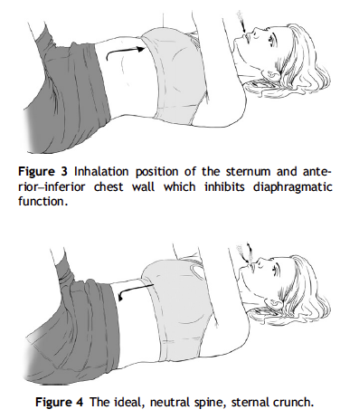 diaghragmatic function. It is noted that the thoraco– lumbar (T/L) junction is hyperlordotic and the diaphragm is oblique in this position (see Fig. 3 ). Ideally, a caudal anterior chest position is facilitated which is the ‘‘exhalation’’ position. In this case, the T/L junction is more neutral and the diaphragm is ‘‘centrated’’ in a horizontal position (see Fig. 4 ). The ‘‘exhalation’’ position is believed to be facilitory of the abdominal wall since active exhalation is produced by the abdominal muscles.