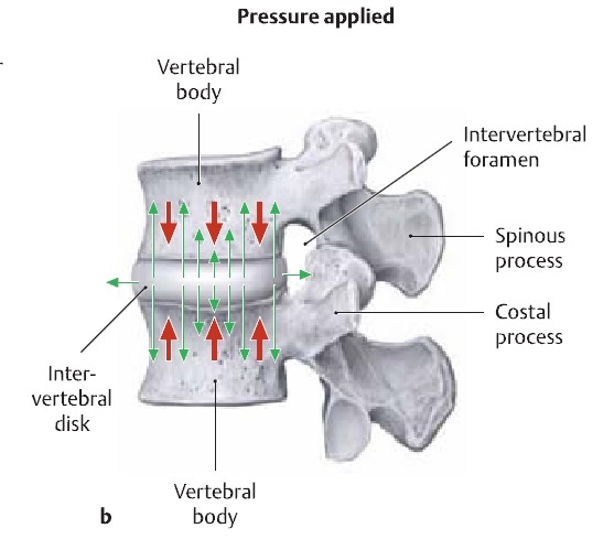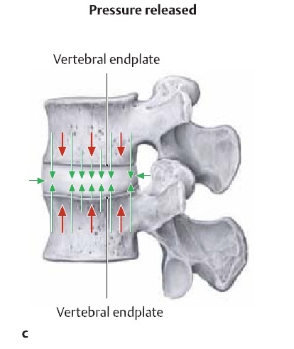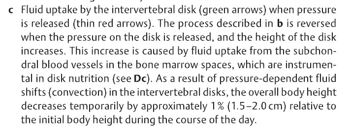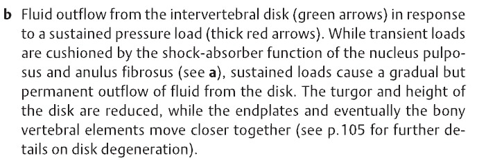 - 지속적인 압력에 반응하여 추간판으로부터 액체가 빠져나감. 순간적인 추간판의 부하는 수핵과 섬유륜의 기능인 충격흡수에 의해서 작용하교, 지속적인 부하는 디스크로부터 액체가 점차적으로 하지만 지속적으로 빠져나감. 이때 디스크의 높이가 감소하고, 종판과 척추는 점차 가까워짐.