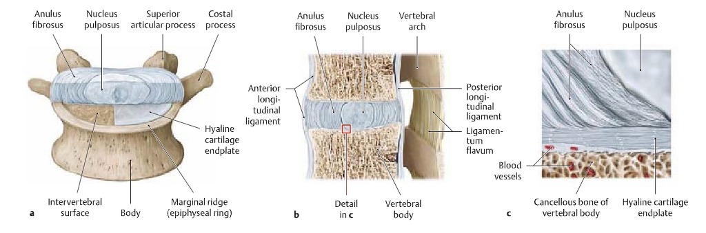 - 추간판에 가해지는 부하가 줄어들때, 액체는 디스크로 들어옴. 이때 디스크의 높이는 증가함. 디스크 높이의 증가는 연골하 혈관으로부터 액체의 흡수에 의해 일어남. 이러한 기전에 의해서 디스크는 영양이 공급됨.