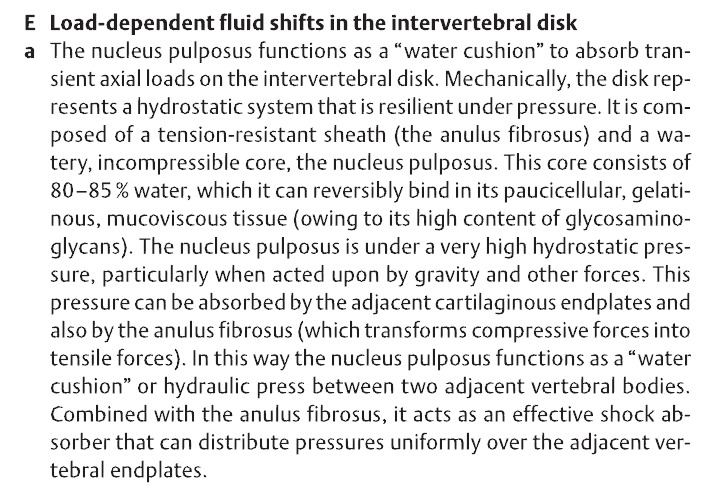 추간판의 수핵은 물쿠션처럼 작용해서 압력하에서 회복력을 갖는 hydrostatic system을 갖음 ->충격을 흡수