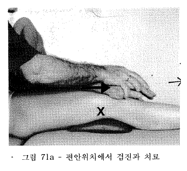 이 상태에서 위 그림처럼 원위 방향으로 미끄러뜨리면서(distal glide) 검진과 치료를 실시하게 되는데, 환자의 대퇴를 받침대 위에 고정시키는 것이 중요하며, 치료사는 왼손으로 환자의 슬개골을 감싸서 잡고, 오른손으로는 왼손을 돕는다. 그런 뒤에 양손으로 환자의 슬개골을 윈위(distal) 방향으로 움직이면 된다.