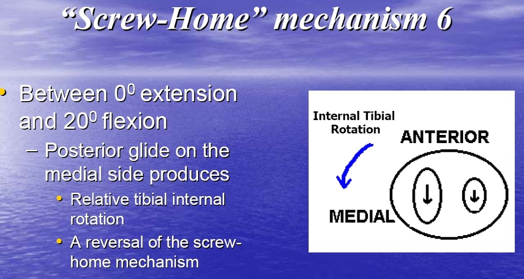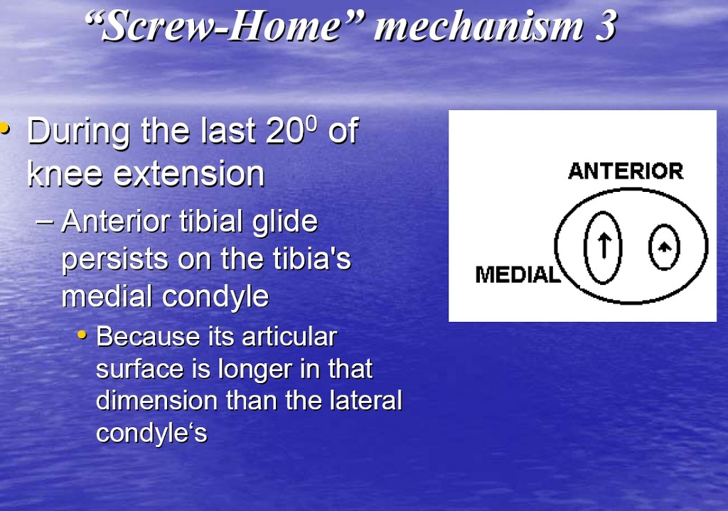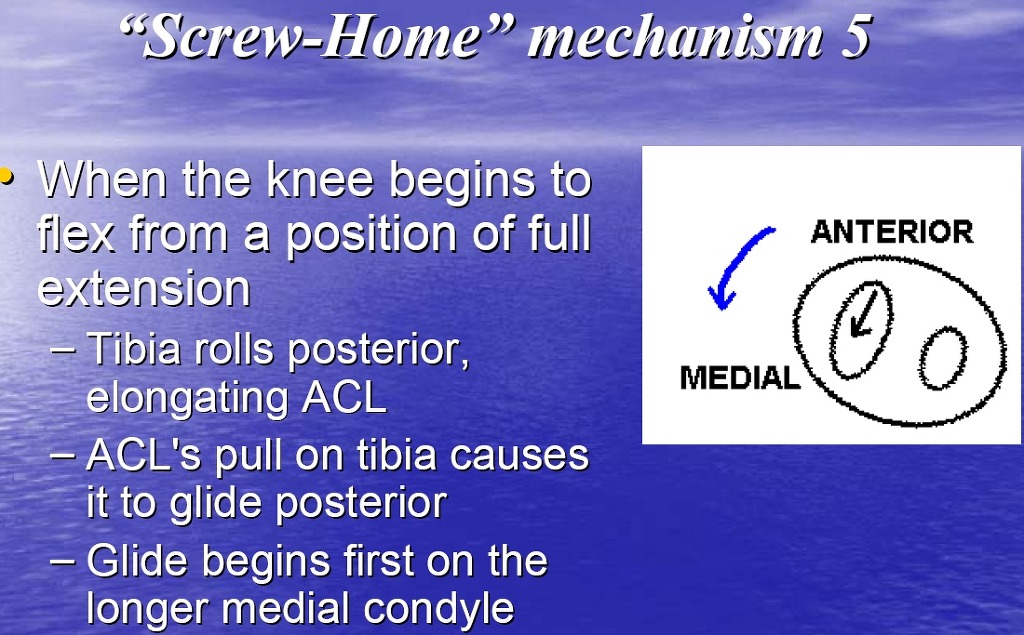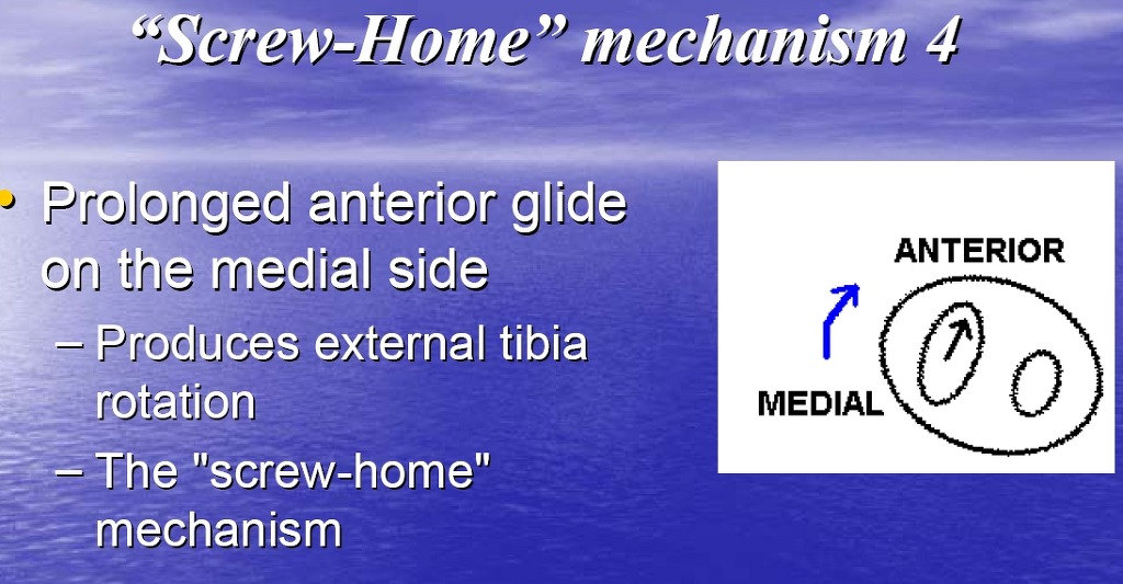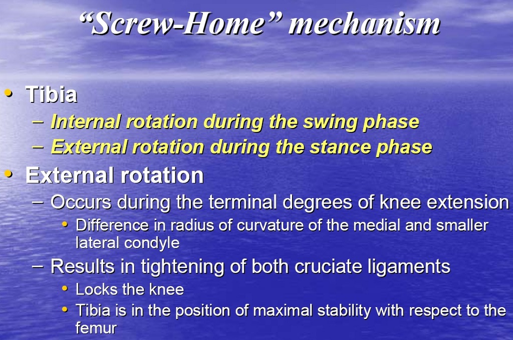 This is the name given to the action when a knee reaches full extension and just as the knee locks into hyperextension the knee rotates in an outward direction just a few degrees. This has the effect of putting most of the weight onto the cartilage, menisci, and bones of the joint while giving a rest to the muscles of the thigh and calf. What allows for this is that the medial femoral condyle is slightly curved and the medial condylar notch is slightly longer than the lateral condylar notch. The ACL and to some extent the PCL are important in guiding this movement of the bones.