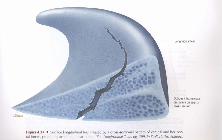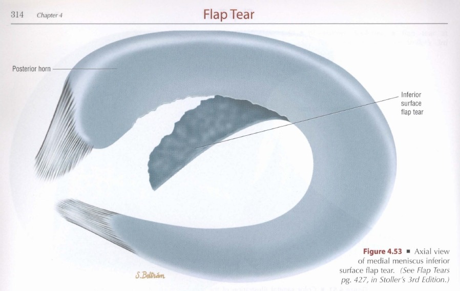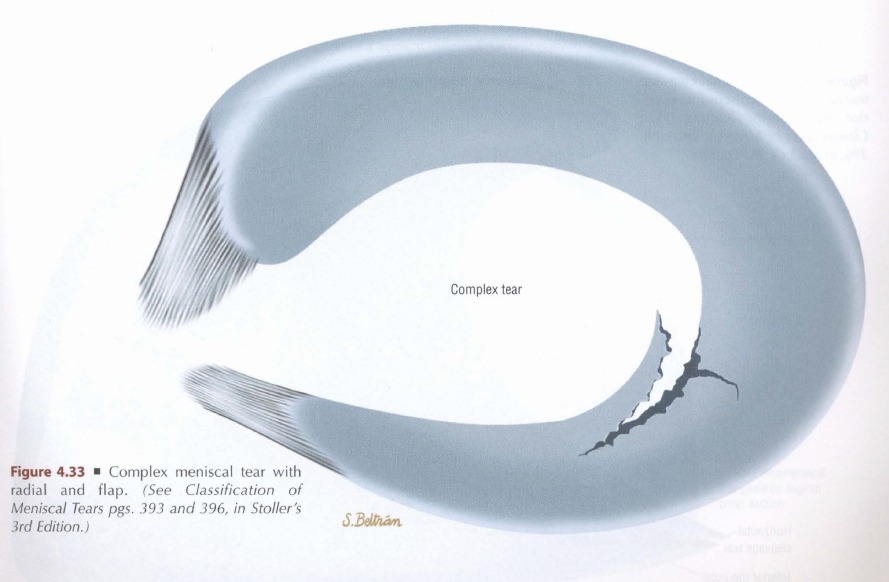 1 Peripheral tear 2 Bucket-handle tear 3 Longitudinal or flap tear of the anterior horn 4 Radial tear of the posterior horn -