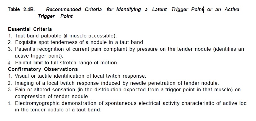 활동성 근막통 유발점(active myofascial trigger point) : 임상적인 통증을 유발하는 근막 통증지점으로 항상 통증(tender)이 있고, 근육의 완전신장을 방해하고, 근력약화를 야기, 직접 압박(direct compression)에 환자는 통증으로 인지하고, 적절한 자극을 받을때 근섬유는 국소적 연축(local twitch) 반응을 보임. 환자의 통증 내성내에서 압박될때는 통증 연관통 범위내에 referred motor phenomena가 생성되고, 때로는 자율신경 반응(autonomic phenomena)이 발생하고, 통증 연관지역내에서 tenderness 를 야기함.