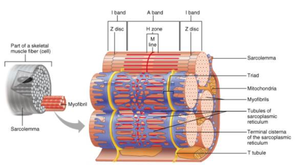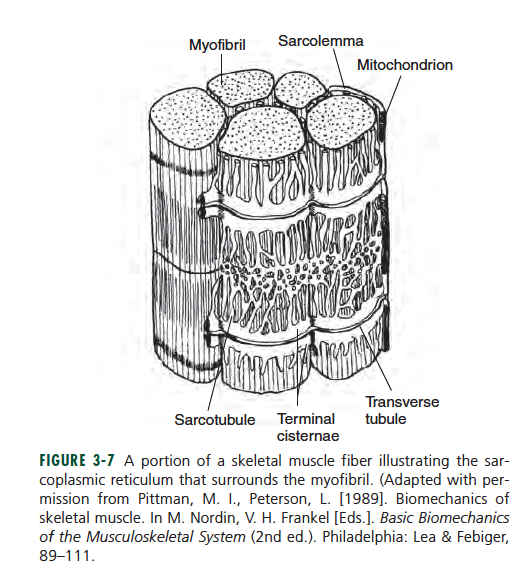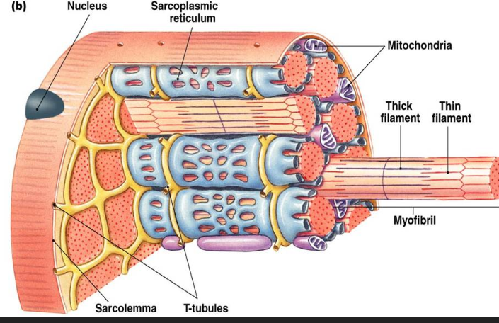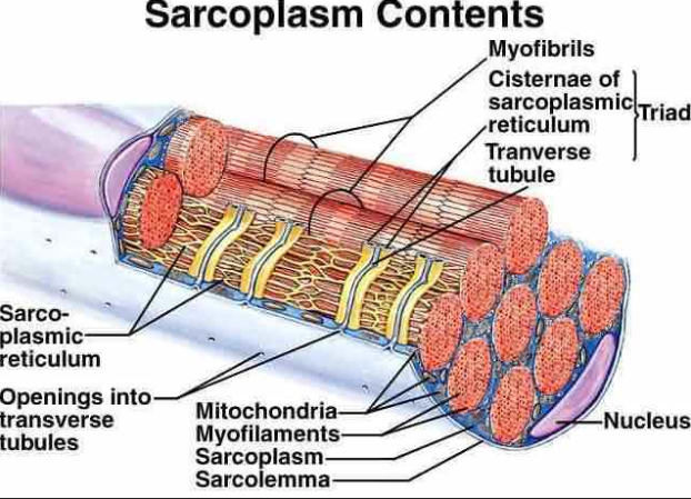The remainder of the fiber consists of the usual organelles, such as the mitochondria, the sarcoplasm, sarcoplasmic reticulum, and the t-tubules (or transverse tubules ).