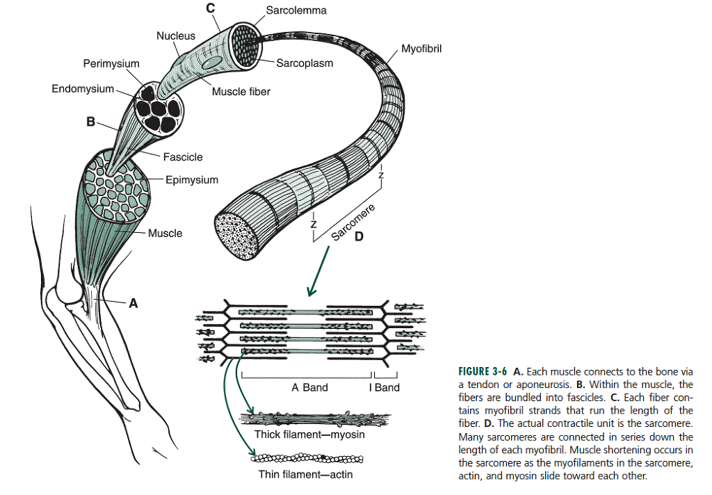 The anatomy of a skeletal muscle is presented in Figure 3-6. Each individual muscle usually has a thick central portion,the belly of the muscle. Some muscles, such as the biceps brachii, have very pronounced bellies, but other muscles, such as the wrist flexors and extensors, have bellies that are not as apparent.