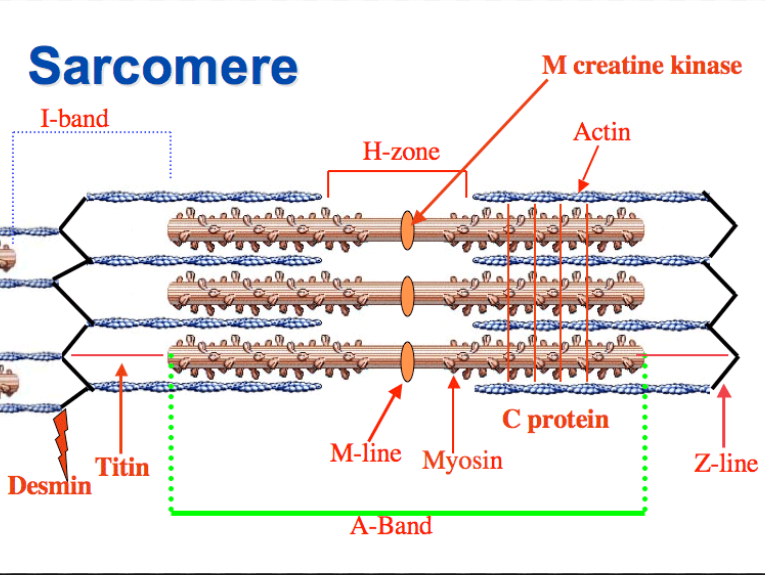 One unit of these bands is called a sarcomere. This structure is the actual contractile unit of the muscle that develops tension. Sarcomeres are in series along a myofibril. That is, sarcomeres form units along the length of the myofibril much like the links in a chain.