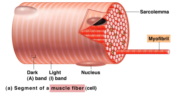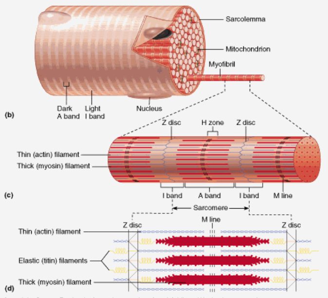 근원섬유는 직경이 1 to 2 μm이고, 근섬유의 길이와 함께함. 근원섬유는 밝은 필라멘트와 암흑 필라멘트가 cross-striated되어 반복되는 띠형태로 연결되어 있음. 어두운 띠는 두꺼운 단백질 미오신이고, 밝은 띠는 얇은 폴리펩타이드 액틴임.