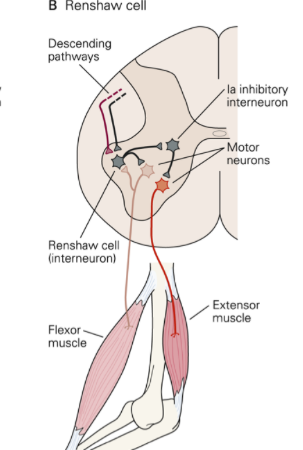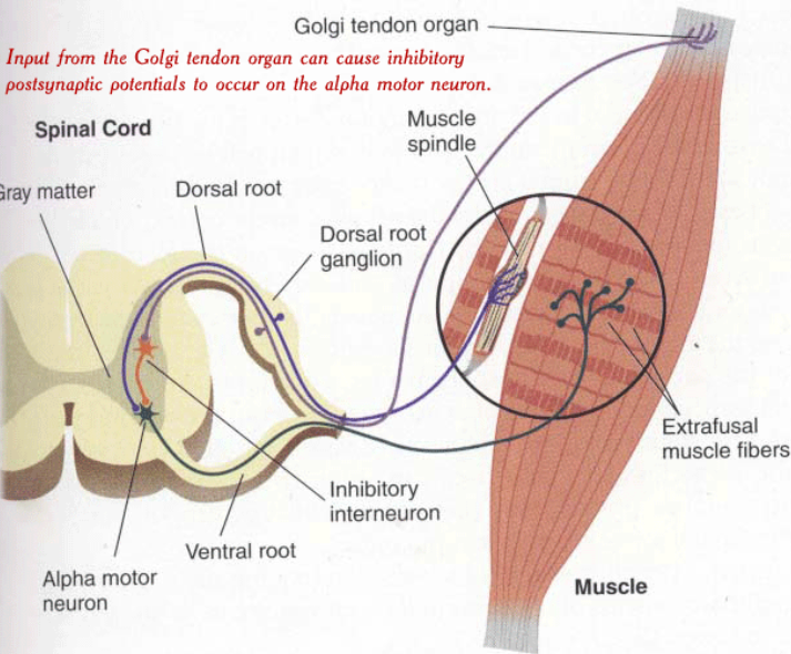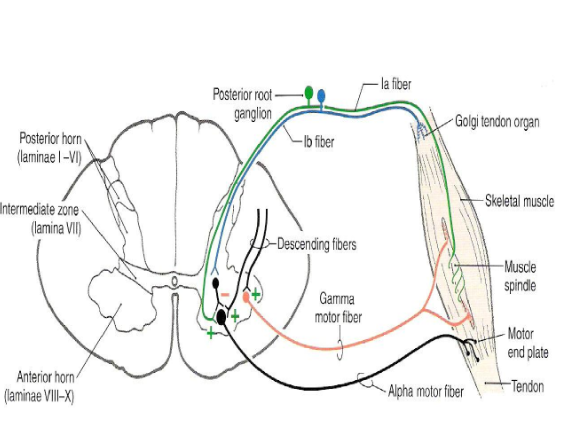 -1a Inhibitory Neuron: Responsible for inhibiting antagonist motor neuron. 1a spindle afferents activate 1a inhibitory neuron./1b Inhibitory Neuron: afferent or Golgi tendon organ activates