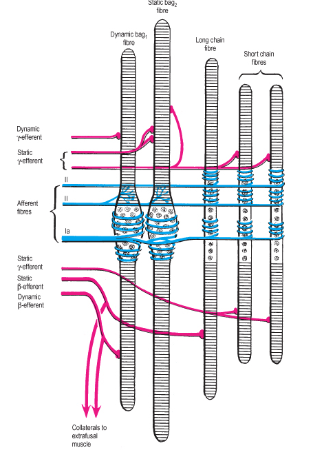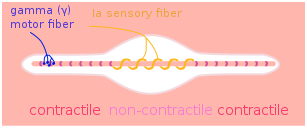 - In mammals including humans, the motor component is provided by up to a dozen gamma motoneurons and to a lesser extent by one or two beta motoneurons. Gamma and beta motoneurons are called fusimotor neurons, because they activate the intrafusal muscle fibers. Gamma motoneurons only innervate intrafusal muscle fibers, whereas beta motoneurons innervate both extrafusal and intrafusal muscle fibers and so are referred to as skeletofusimotor neurons.