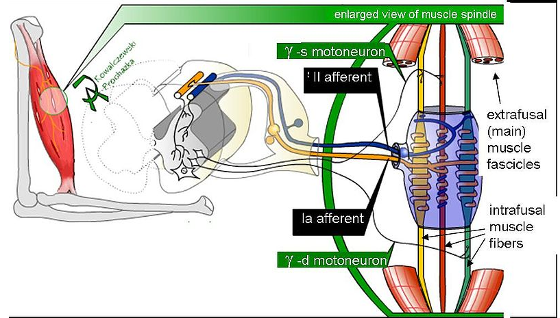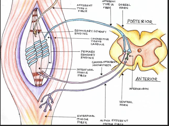 - 각각의 근육내에는 근방추라는 감각신경을 가짐. 근방추 스트레칭은 Ia신경 임펄스의 시작으로 발생함. 그 임펄스는 감각축삭을 따라서 척수로 전달되고 추외근섬유(대퇴사두근은 활성화, 햄스트링은 억제)를 자극함.