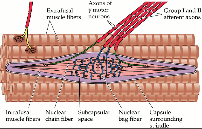 Each muscle spindle consists of sensory nerve endings wrapped around special muscle fibers called spindle fibers (also called intrafusal fibers). Stretching a spindle fiber initiates a volley of impulses in the sensory neuron (a I-a neuron) attached to it. The impulses travel along the sensory axon to the spinal cord where they form several kinds of synapses.