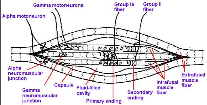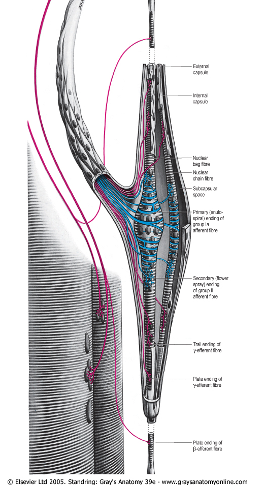 - 일차와 이차 감각신경섬유는 추내근섬유의 중앙부분에 종지하여 스트레치-민감성 이온채널을 경유하여 감각부분을 제공함