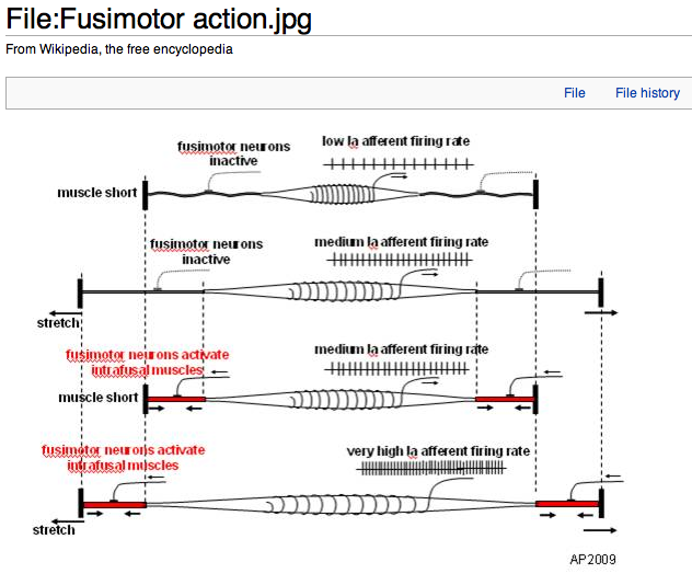 - 3) Fusimotor template of intended movement. Static gamma activity is a "temporal template" of the expected shortening and lengthening of the receptor-bearing muscle. Dynamic gamma activity turns on and off abruptly, sensitizing spindle afferents to the onset of muscle lengthening and departures from the intended movement trajectory.[4]
