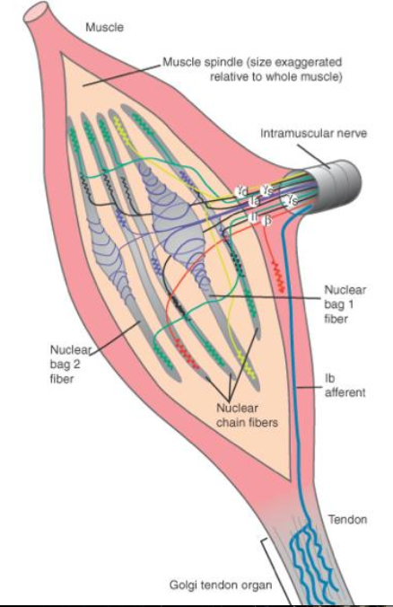 Also note that a similar structure attaching one end to muscle and the other end to a tendon is known as a Golgi tendon organ. However, Golgi tendon organs differ from nuclear chain and nuclear bag fibers in that they are considered in series rather than in parallel to the muscle fibers.