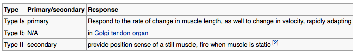 위 두가지는 추내근 섬유를 둘러싼 스트레치 수용기에 두그룹임. 이 수용기는 크고 빠른 섬유임. 그것의 특징은 빠른 적응.