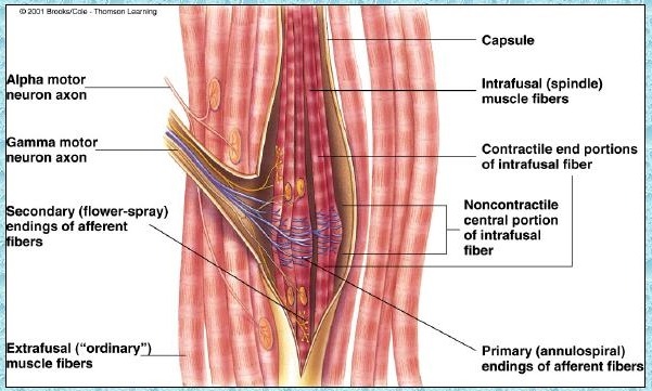 3) intrafusal fiber - 3~12개 bag and chain fiber and fluid-filled cavity - gamma motor neuron - gamma neuromuscular junction