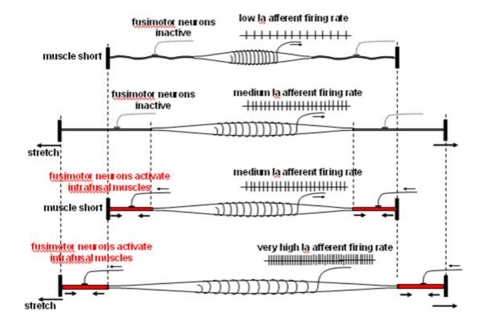 - 추외근 섬유가 짧아지면 fusimotor neuron(beta motor neurons and gamma motor neurons)이 inactive됨. -> Ia afferent firing rate가 낮음.