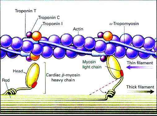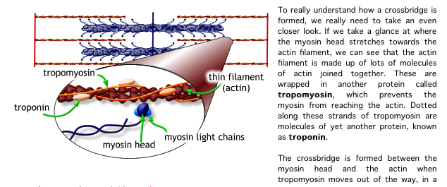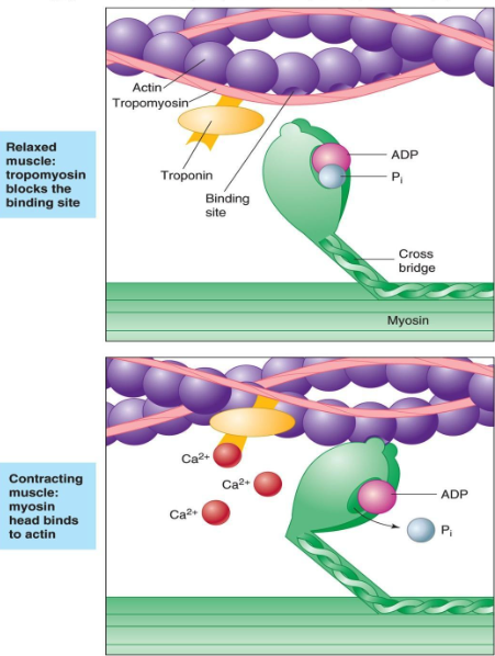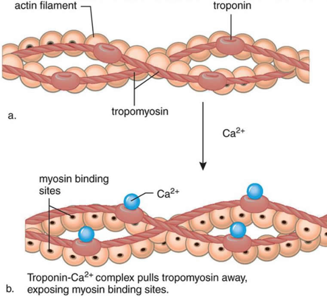 정상상황에서 트로포마이오신은 입체적으로 액틴위의 마이오신을 위한 부착부위를 막고 있음. 칼슘이 트로포닌 c에 부착하고 트로포닌 단백질에서 알로스테릭한 변화를 초래하면 트로포닌 t는 트로포마이오신이 움직이도록 허용하기 위해 부착부위를 열어줌.