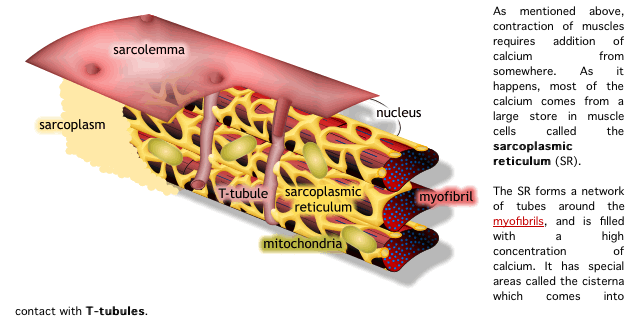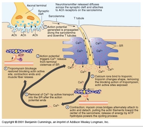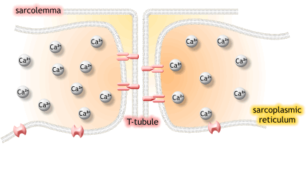 활동전위는 t 튜불내의 voltage-regulated ion gate를 염. 활동전위는 SR의 말단에서 물리적으로 칼슘채널과 연결됨. 그래서 SR에서 문이 열리고 칼슘이 Cytosol내로 빠져나가 cytosol내의 칼슘기울기가 변화함.