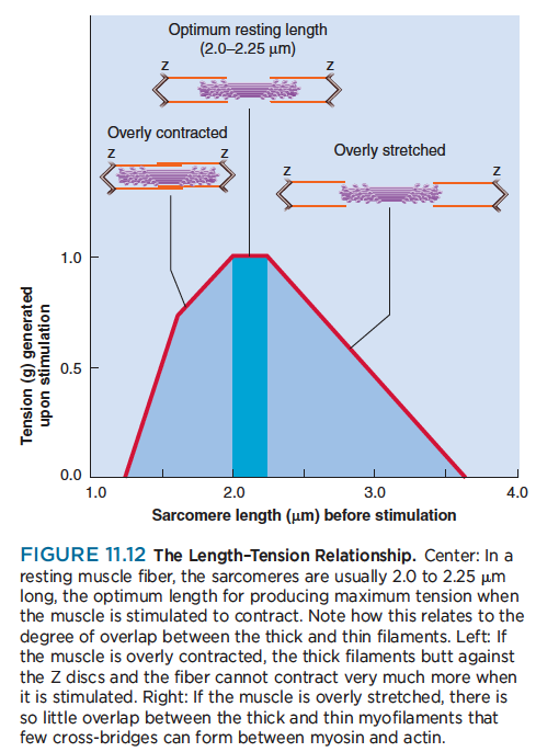 stretched or contracted it was before it was stimulated, among other factors. This principle is called the length–tension relationship. The reasons for it can be seen in figure 11.12. If a fiber is overly contracted at rest, its thick filaments are rather close to the Z discs. The stimulated muscle may contract a little, but then the thick filaments butt against the Z discs and can go no farther. The contraction is therefore a weak one.