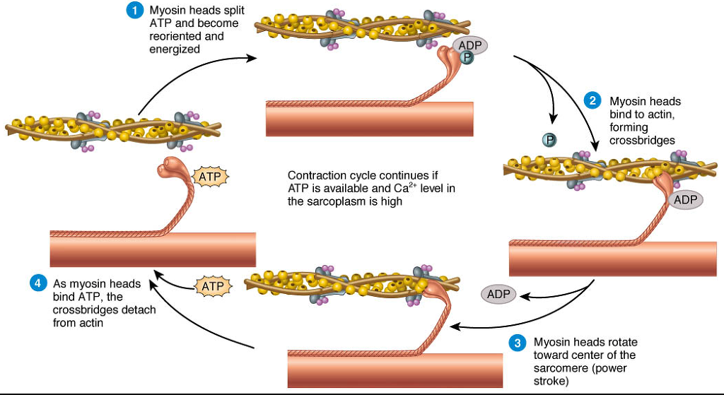 마이오신 헤드는 ATP분자를 가지고 있어 수축과정을 시작함. 마이오신 ATPase는 ATP를 가수분해함. 이과정에 의해서 만들어지는 에너지는 마이오신 헤드를 활성화하여 근육을 신장함.