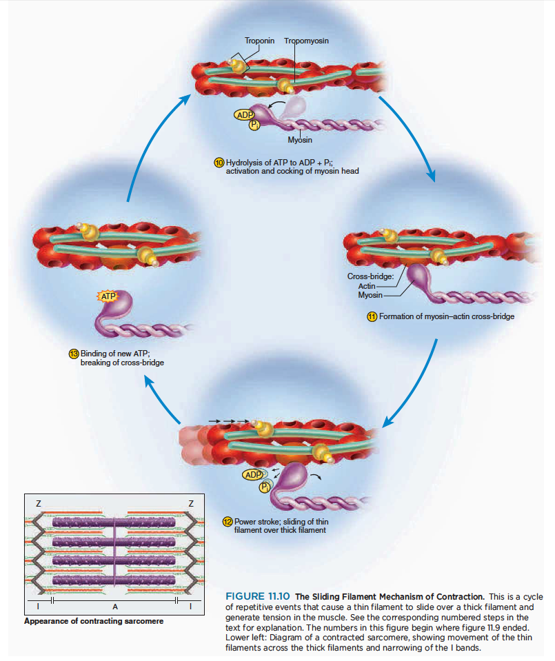 11. Steps 9 and 10 repeat as long as ATP is available and calcium is freely bound within the thin filaments.
