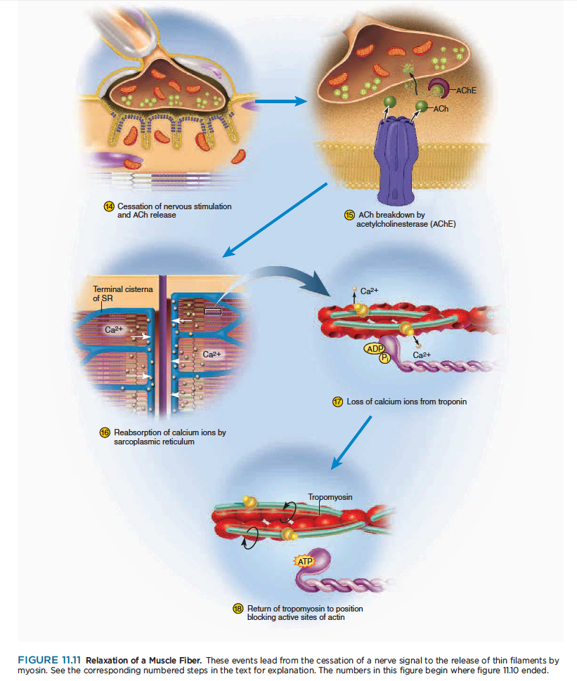When its work is done, a muscle fiber relaxes and returns to its resting length. This is achieved by the steps shown in figure 11.11.