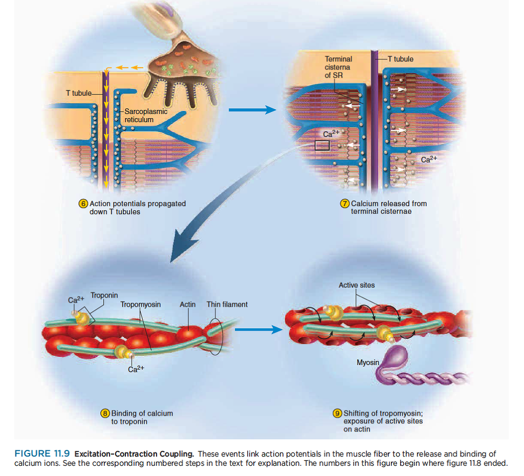 Excitation–contraction coupling refers to the events that link the action potentials on the sarcolemma to activation of the myofilaments, thereby preparing them to contract. The steps in the coupling process are shown in figure 11.9