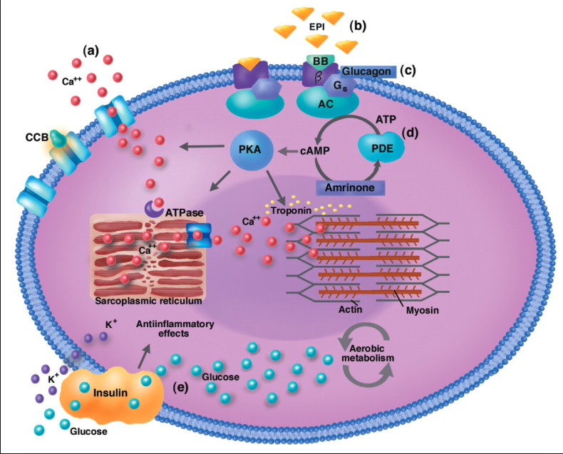 칼슘은 근원섬유의 액틴필라멘트에 있는 트로포닌 C에 부착함. 트로포닌은 알로스테릭하게 트로포마이오신을 조절함.
