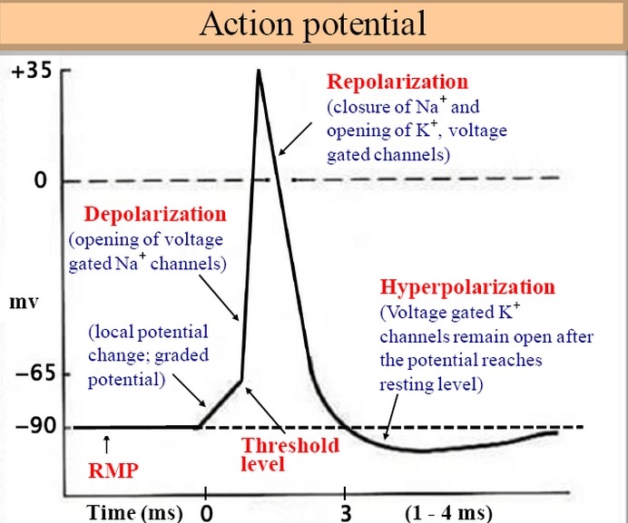 a peak of 75 mV as Na enters, and then falls back to a level close to the RMP as K diffuses out. This