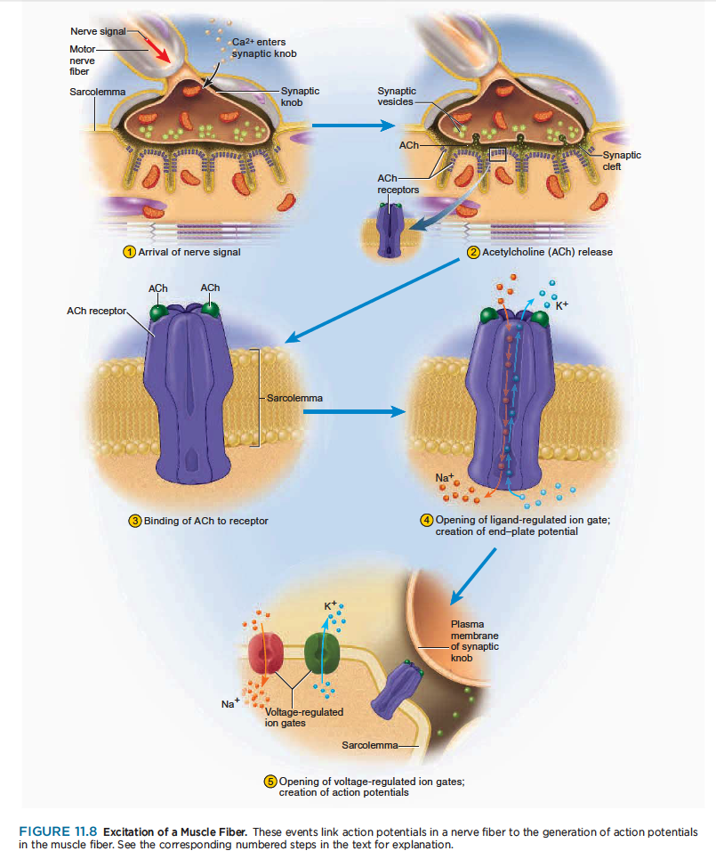 Excitation is the process in which action potentials in the nerve fiber lead to action potentials in the muscle fiber. The steps in excitation are shown in figure 11.8.