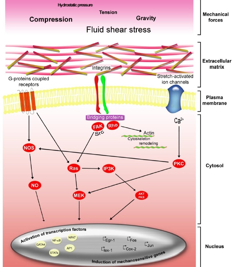Figure 1. Stem cells respond to different mechanical forces loading by activating multiple intracellular signaling pathways that are implicated in the maintenance and regulation of cellular functions. Stem cells can sense the mechanical loading through a diverse group of membrane-anchored mechanosensors (stretch-activated ion channels, cell-membrane-spanning G-protein-coupled receptors, and integrins). This mechanical stimulus is then converted to biochemical signals by triggering the multi-step activation of downstream partners in an array of signaling cascades in the cytoplasm. The convergence of these pathways results in the activation of select transcription factors, including nuclear factor-B (NF-kB) and nuclear factor of activated T cells (NFAT), which then translocate to the nucleus and modulate the expression of a panel of mechanosensitive genes, including Egr1 and lex1.