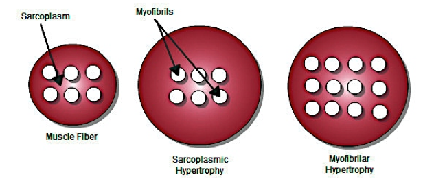 근섬유 비대는 근형질 비대와 근원섬유 비대 두가지로 나뉨.