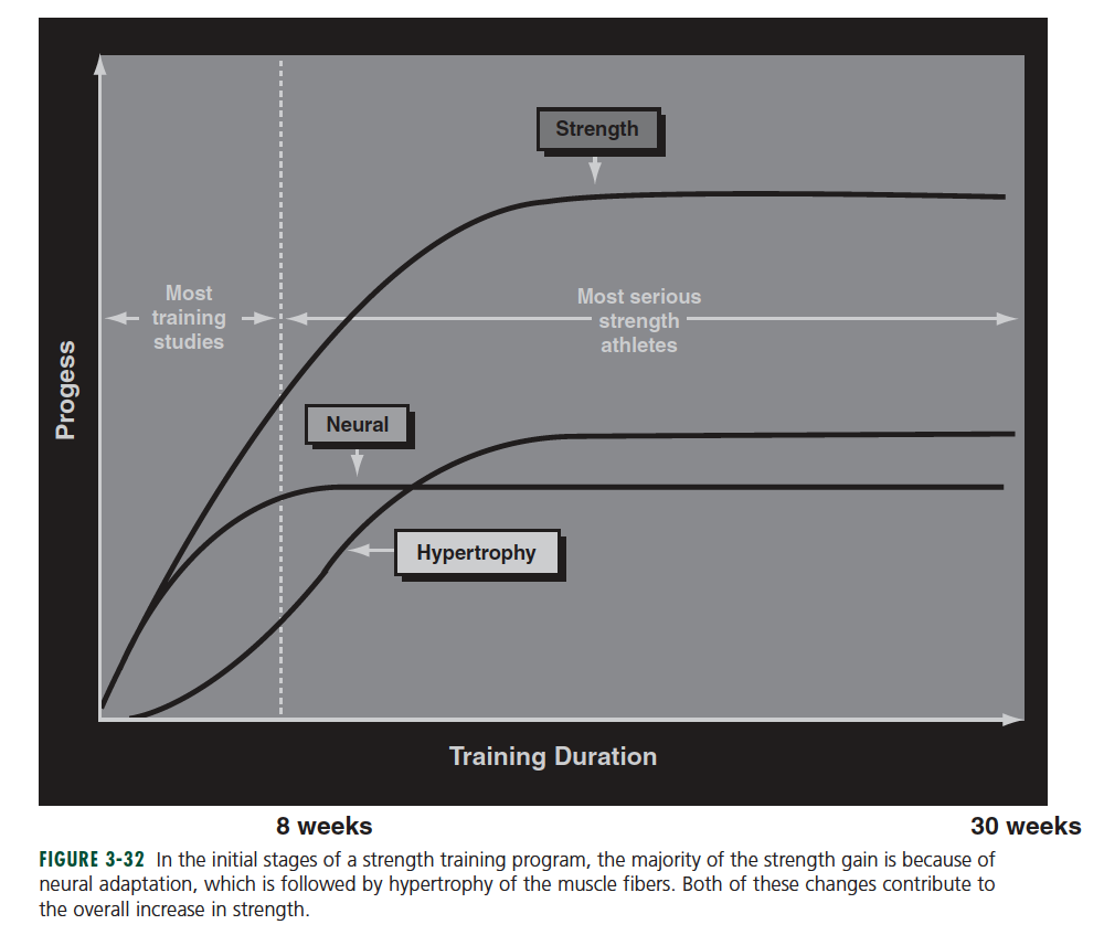 한번도 근력운동을 하지 않은 개인은 며칠내에 측정가능한 근력 증가를 얻을 수 있는데, 이는 근육 사용의 방법을 배워서 증가한 것임.