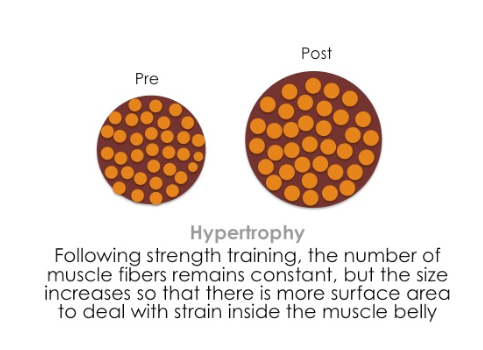근비대는 근력 트레이닝와 짧은 기간, 높은 강도의 무산소적 운동을 통해 증가될 수 있음.