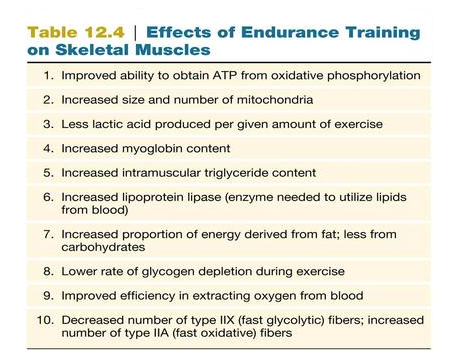 저항운동을 하면 type 2b섬유는 type 2a섬유로 변화하여 type2a 섬유가 많아짐. 이는 근력트레이닝 근육의 산소사용능력이 증가하기 때문으로 믿어짐. 그래서 강한 힘을 내면서도 산소이용능력이 증가하기 때문에 오래 사용할 수 있음.