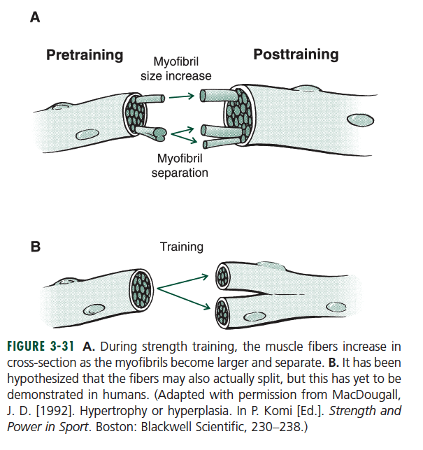 반면에 근원섬유 비대는 액틴과 마이오신 양이 증가하여 근력이 증가할 뿐 아니라 근육의 사이즈도 증가함.